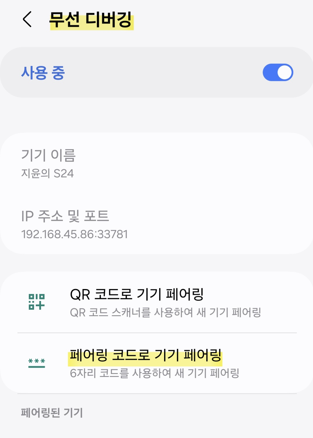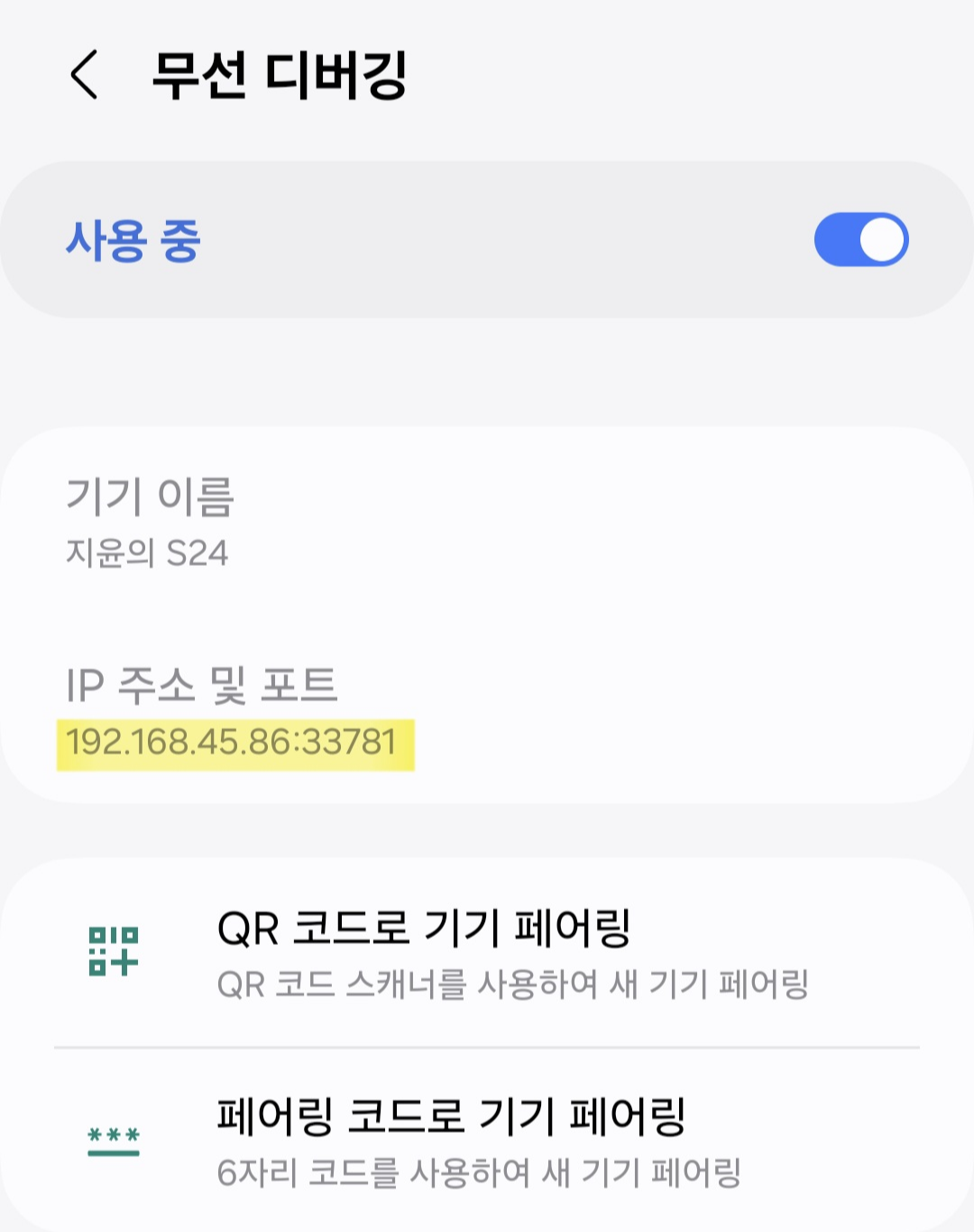 스마트폰 설정 → 개발자 옵션 → '무선 디버깅' 활성화