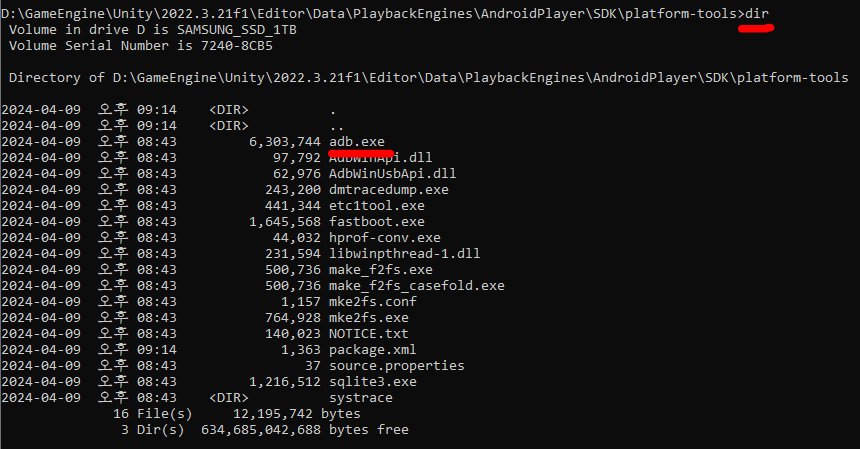 또 입력해서 'adb.exe'가 있는지 확인합니다.