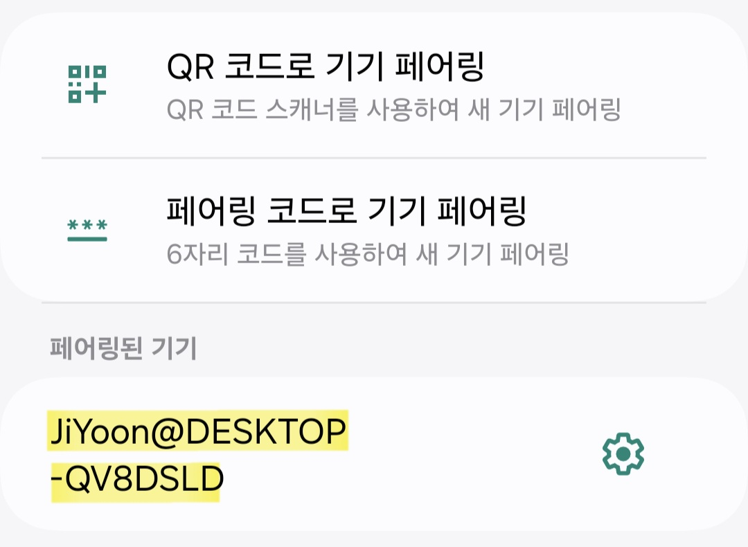 그러면 이렇게 페어링된 기기에 제 컴퓨터 이름이 표시됩니다.