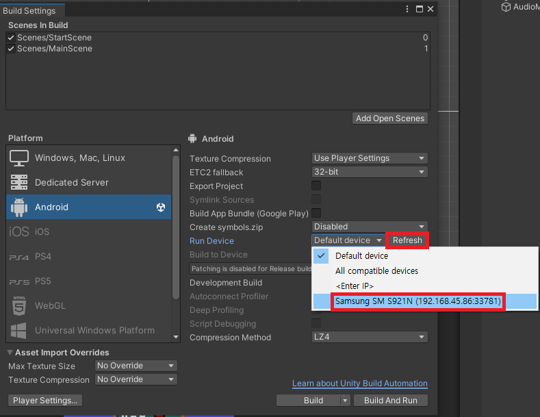 유니티로 다시 돌아와서 Refesh버튼 클릭하고 디바이스 목록을 보면 제 디바이스가 보이네요~