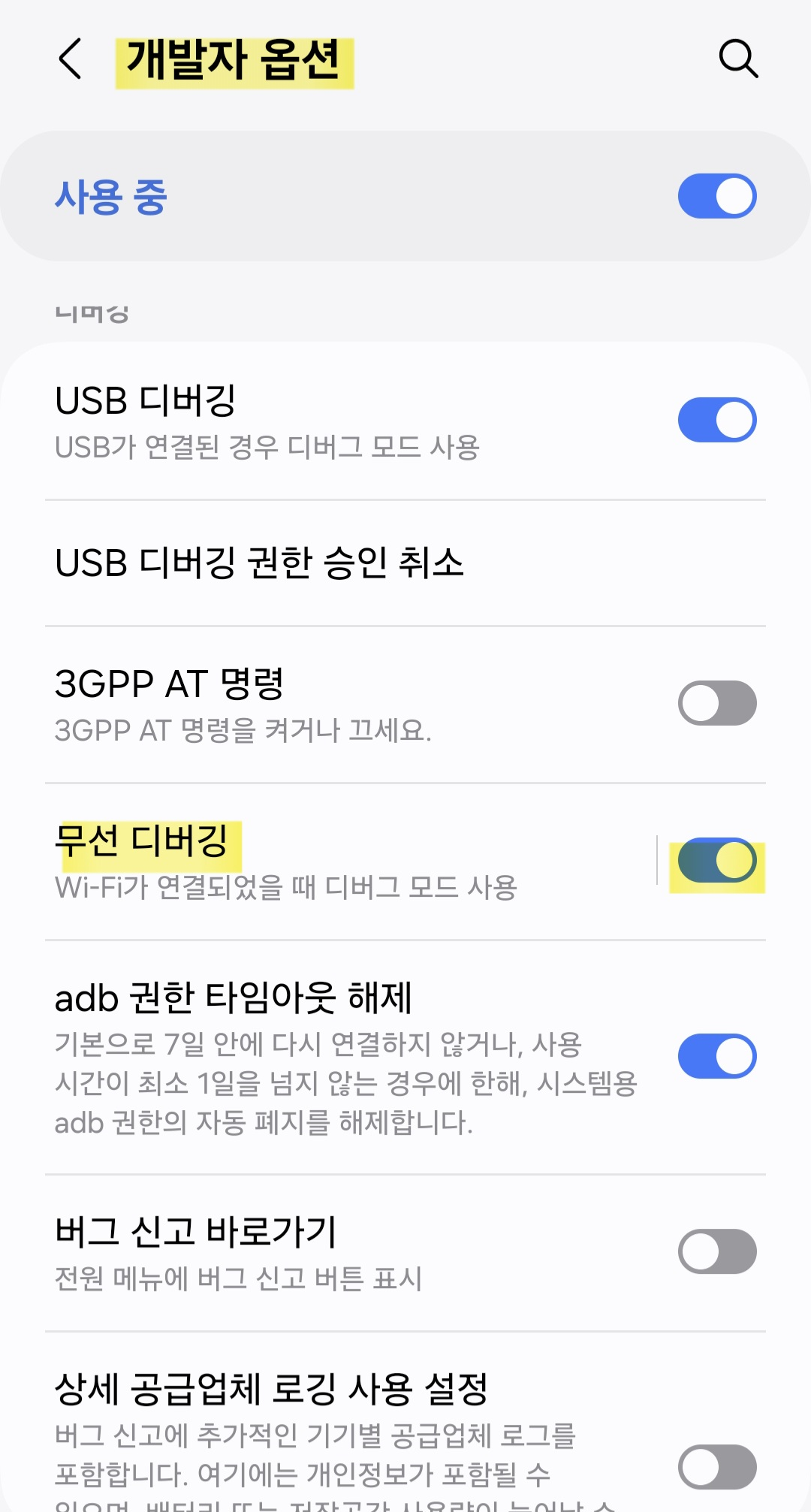 무선디버깅이 다 끝나고 나면 꼭 해제 해주셔야합니다!