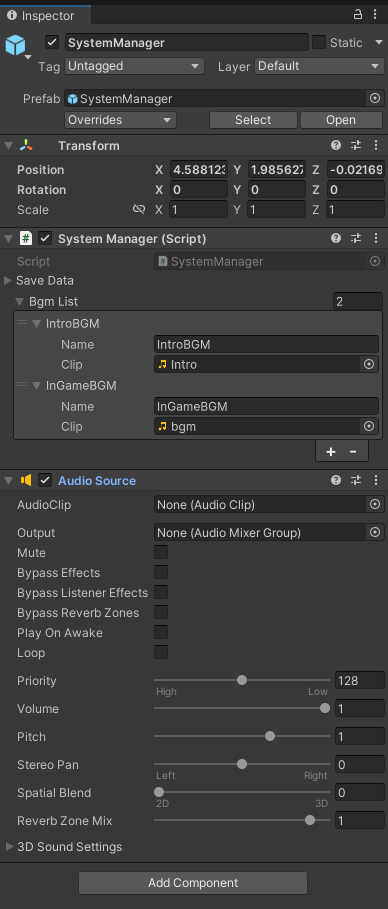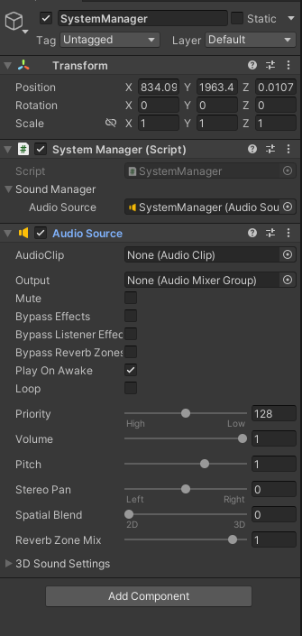 그래서 SystemManager에 AudioSource 컴포넌트를 추가하고