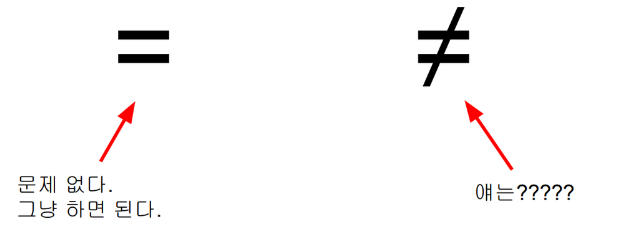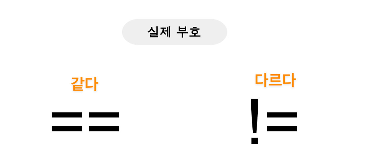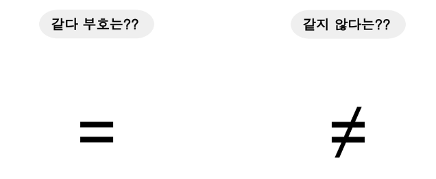 두가지 값이 같은지 아닌지 표현할 때 아래와 같은 기호를 사용할 수 있습니다.