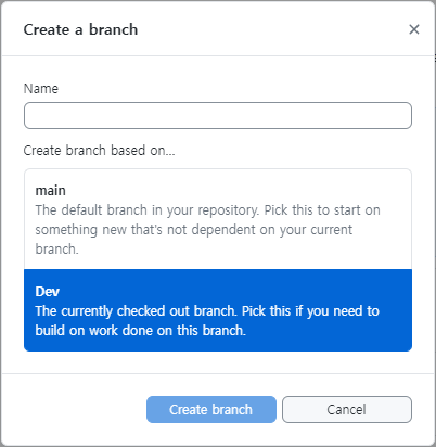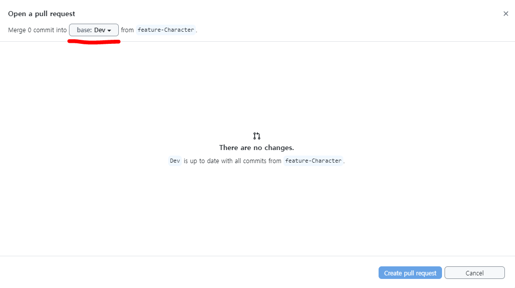 다만 주의할 점은 pull request 진행 시 base는 `Dev`로 설정해야 한다는 것!
