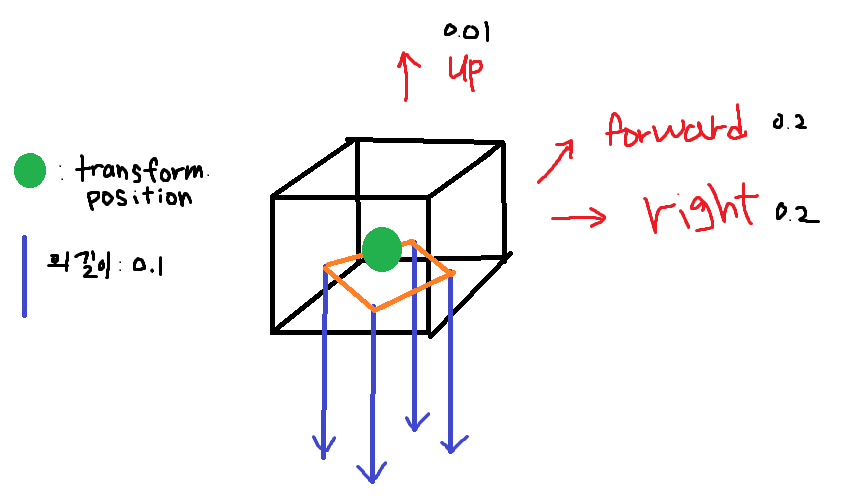 `transform.up`을 더해주는 이유는 플레이어랑 땅이랑 완전 딱 붙어있으면 충돌 체크가 안될 가능성도 있기 때문에 약간 위에서 레이가 시작되게 하려는 것이다.