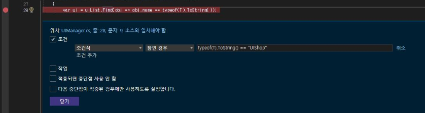 - 특정 조건을 만족 시킬경우만 중단하는 중단점