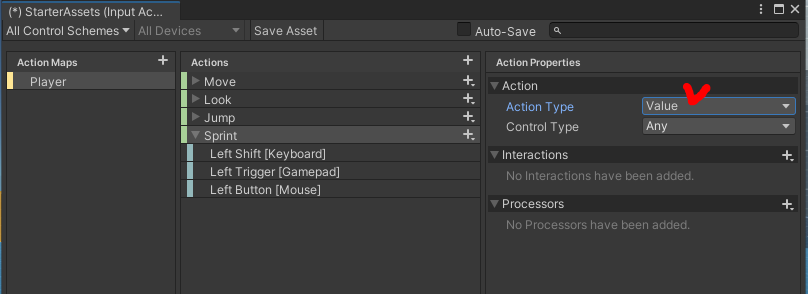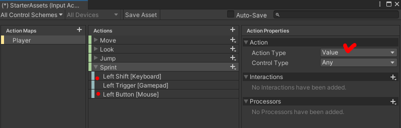 `Action Type`은 `Value`로 두고, 게임패드가 없으니 키보드와 마우스 입력장치를 사용한다.