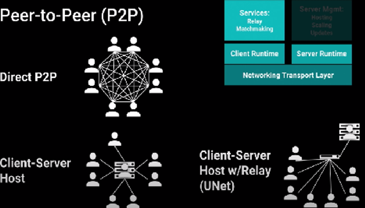 - `Host-Client`: 한 플레이어가 게임 호스트와 클라이언트의 역할을 모두 수행합니다. 소규모 멀티플레이어 게임에 적합하다.