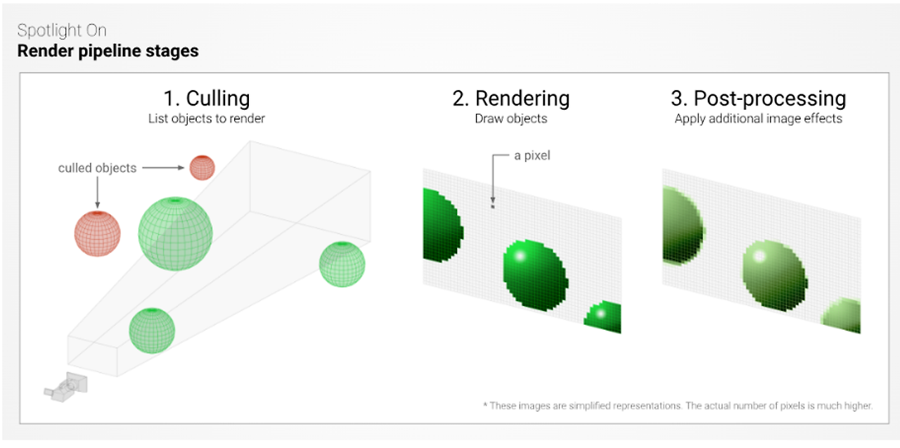 - 렌더링(Rendering): 이 단계에서는 선택된 객체가 화면에 그려집니다. 위의 그림에서 객체가 픽셀로 변환되는 과정을 보여주며, 단일 픽셀이 예로 강조되어 있습니다.