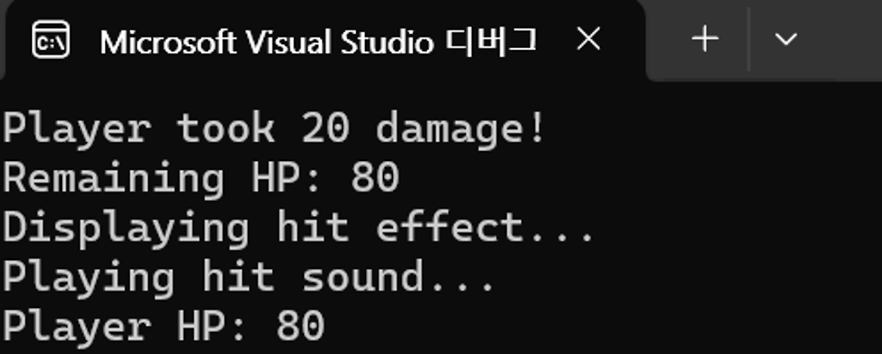 조건 : 데미지를 받는 로직을 처리하는 TakeDamage 메서드 안에서 `DisplayStatus`, `DisplayHitEffect`, `PlayHitSound`를 직접 호출하지 않고 코드를 완성해봅시다.