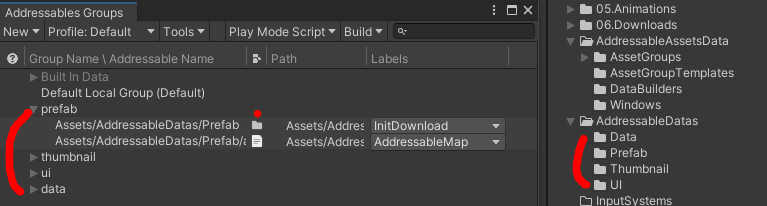 유니티 패키지매니저에서 `Addressable`을 설치하면 `AddressableAssetsData`라는 폴더가 생긴다.