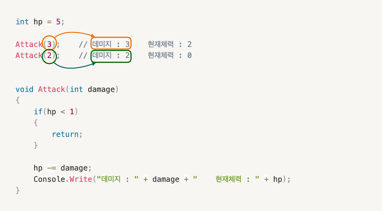 Console.Write("데미지 : 1 현재체력 : " + hp);