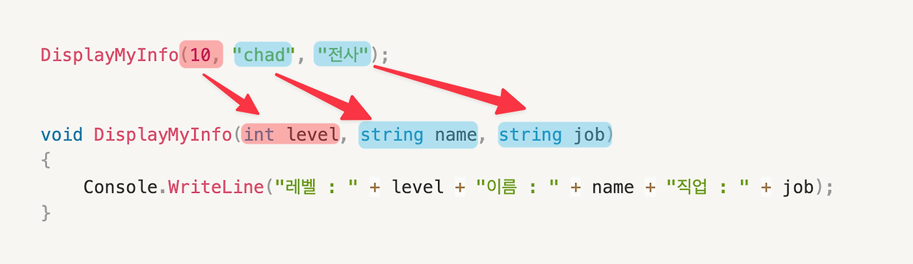 Console.WriteLine("레벨 : " + level + "이름 : " + name + "직업 : " + job);
