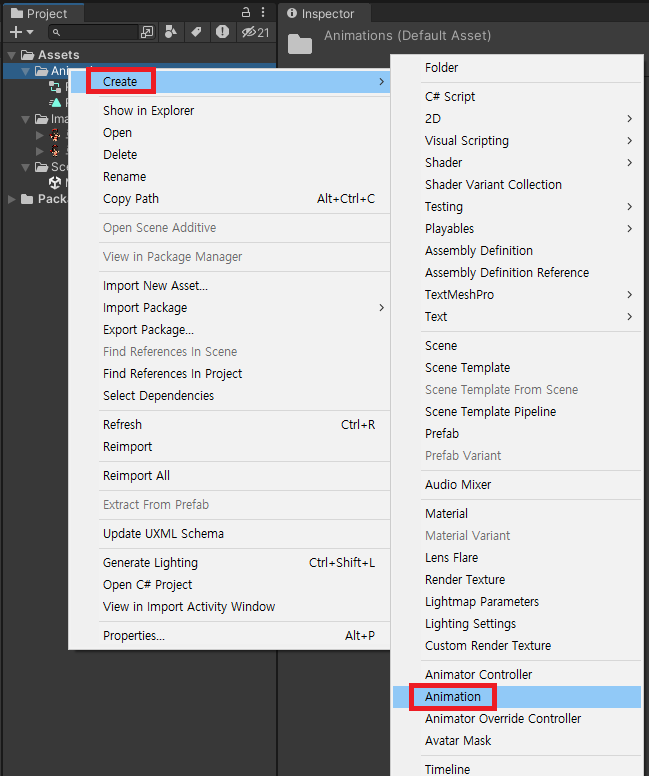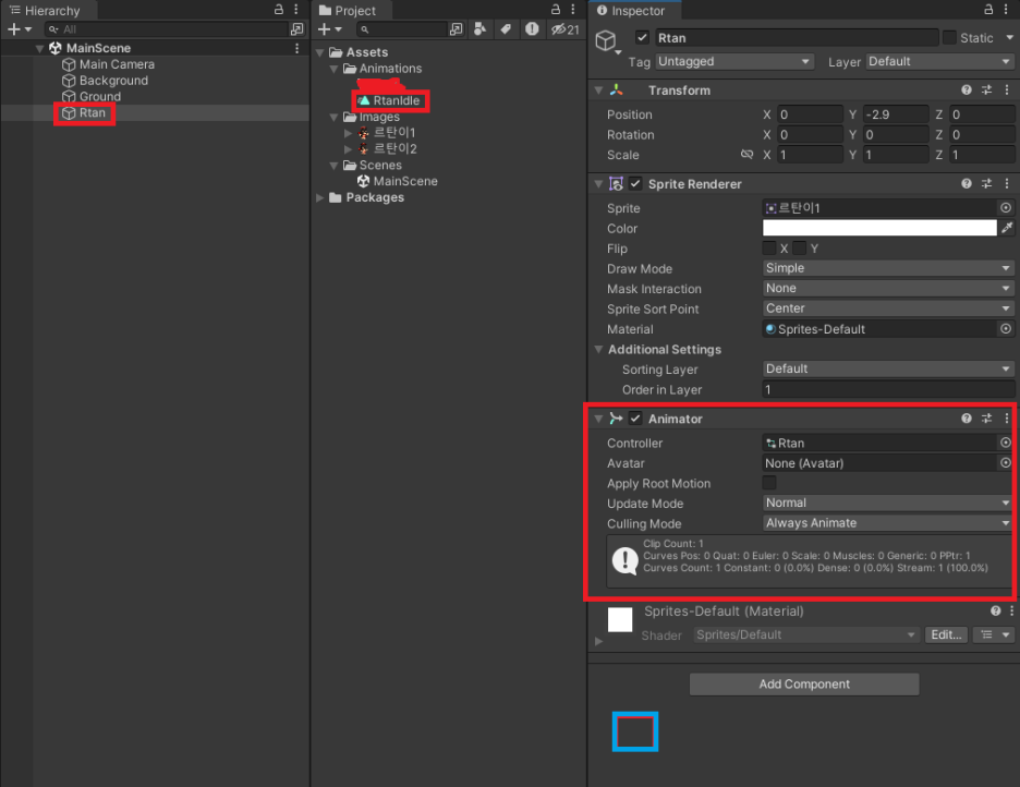 Hierarchy창에 있는 Rtan을 클릭하면 인스펙터창에 정보가 뜨는데, RtanIdle을 파란 네모 영역으로 드래그 앤 드롭 해주시면 Animator이라는 컴포넌트가 생성됩니다.