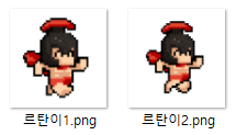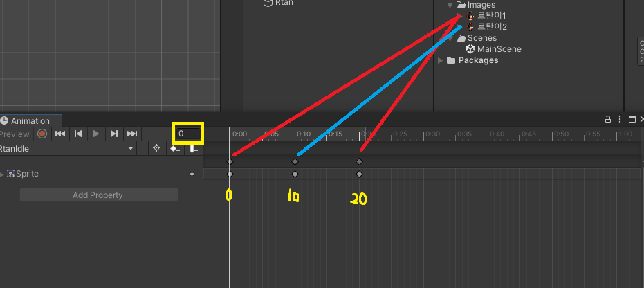 노란색 칸의 숫자 0, 20에 르탄이1을, 20에 르탄이2를 드래그 앤 드롭을 해주시면 간단한 애니메이션 완성!