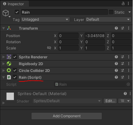 이 스크립트를 Rain 오브젝트에 추가하겠습니다.
