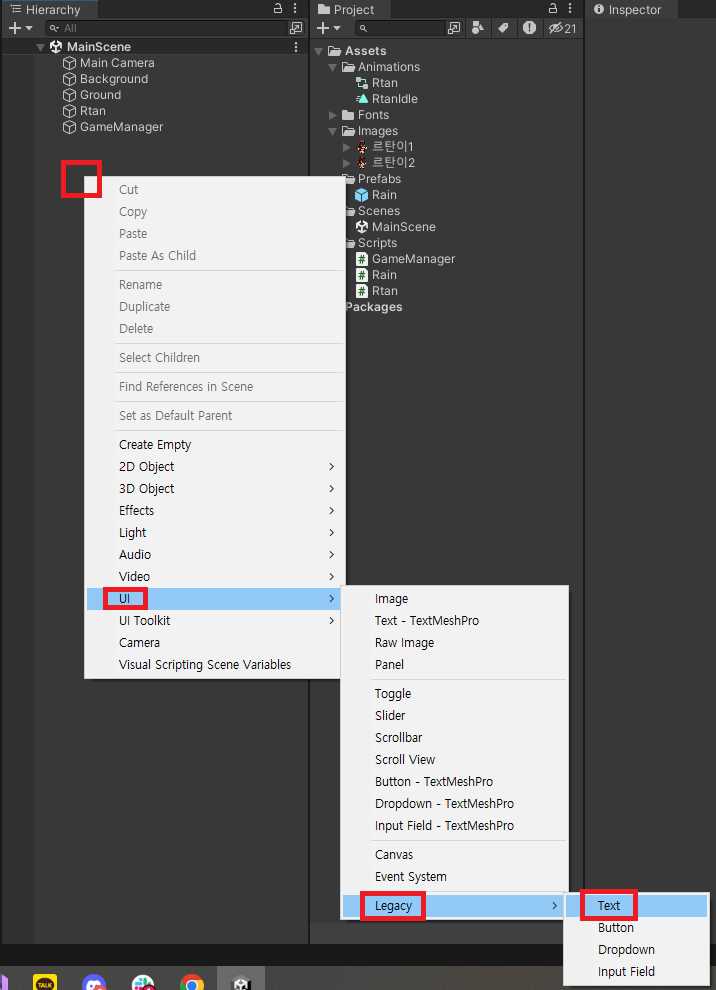 점수 보드를 만들어 보겠습니다. 우선 Hierarchy창에 마우스 우클릭을 해주세요.