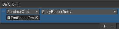 그러면 EndPanel이 뜨고, EndPanel을 눌렀을 때 Retry 함수가 호출이 됩니다.