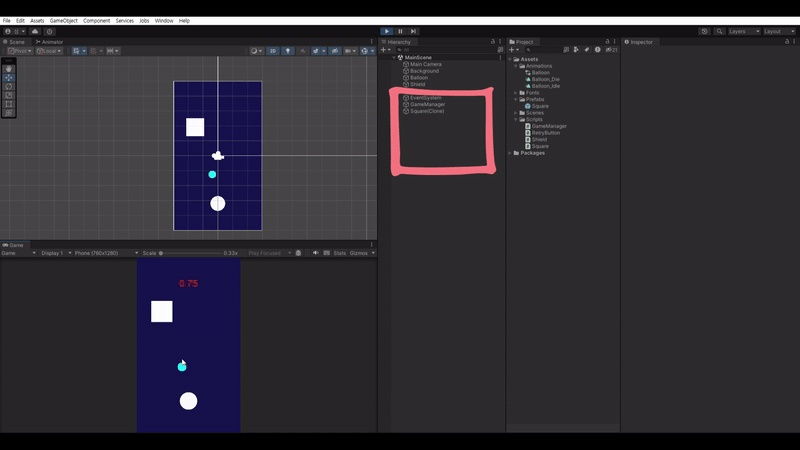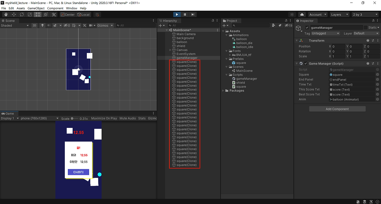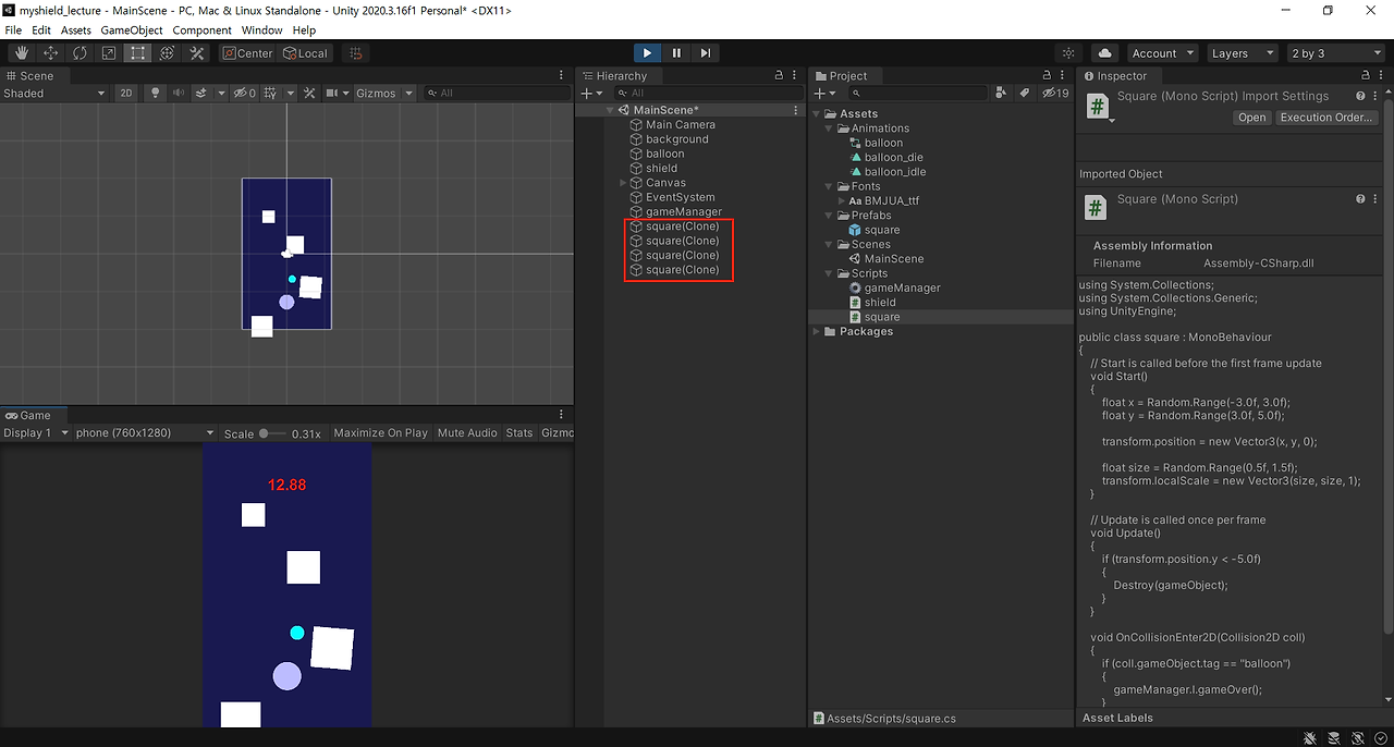 → 화면에 보여지는 네모와 square(clone) 수가 일치하면 완성!