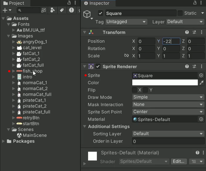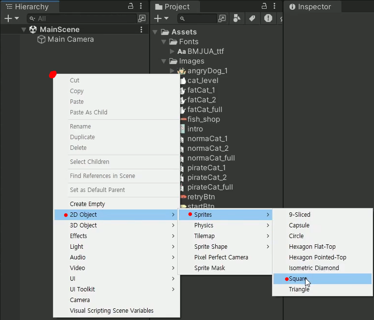 이때까지는 직접 Sprites → Square 에 들어가서 오브젝트를 생성했었는데, 리소스를 받아서 개발하는 것이 더 편하다라는 것을 알려드리려 합니다.