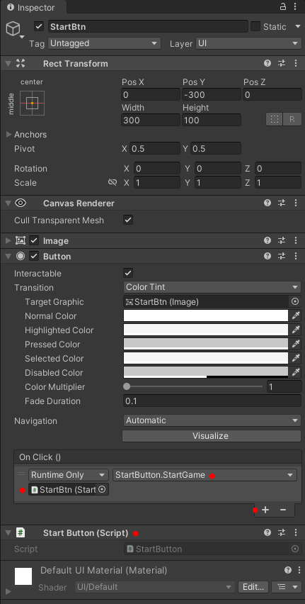 Start Button 스크립트를 StartBtn 오브젝트에 넣어주고,