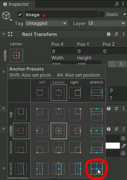 그래서! 캔버스 밑에 이미지 오브젝트로 가서 Anchor를 변경해보겠습니다.