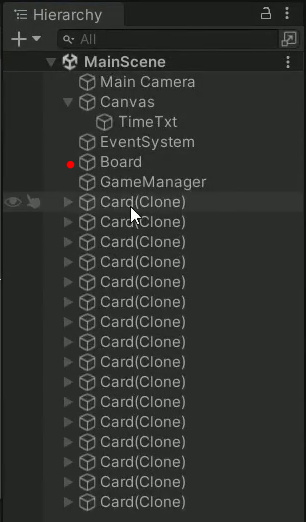 실행해보면 Hierarchy창에 16개의 Card 프리팹이 생성된 것을 볼 수 있습니다.