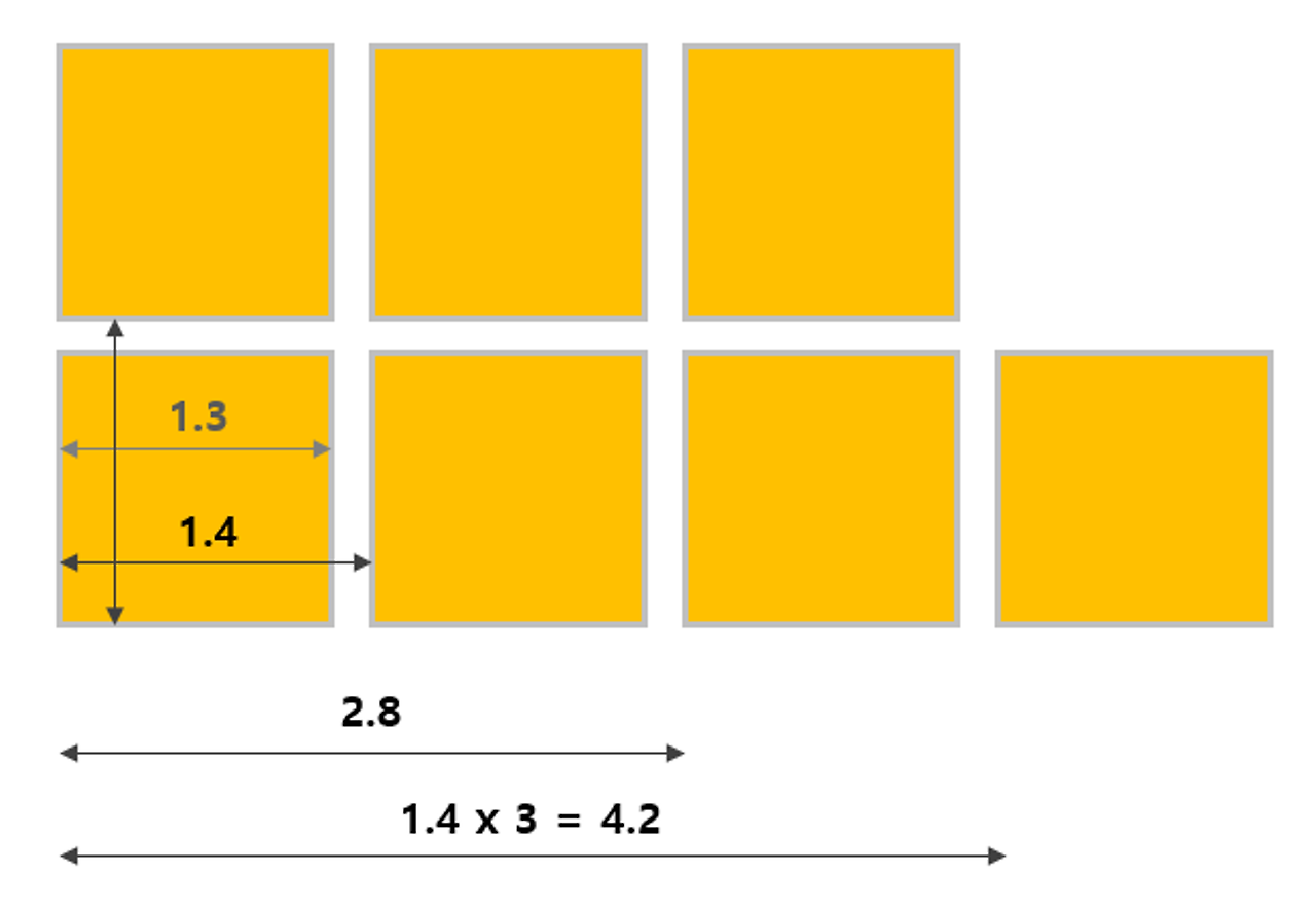 카드의 가로, 세로 사이즈는 각각 1.3이고, 0.1 간격으로 떨어져서 배치하려고 합니다.