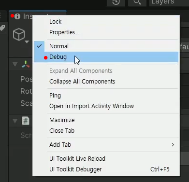 Inspector 문구에 우클릭 해주시고, Debug를 눌러주시면