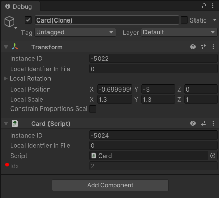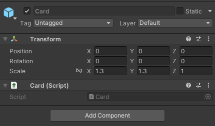 이전에 만들었던 카드 프리팹에 Card.cs를 붙여줬습니다.