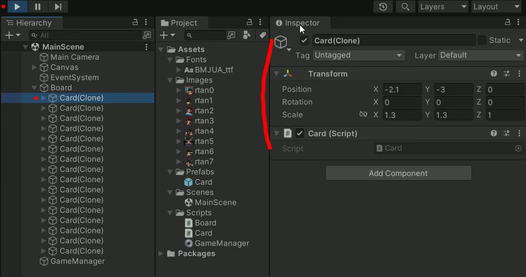 마지막 줄에 'go.GetComponent<Card>().Setting(arr[i]);'가 추가되었죠? 이 부분을 통해 카드마다 랜덤한 숫자값을 지정해주게 됩니다.