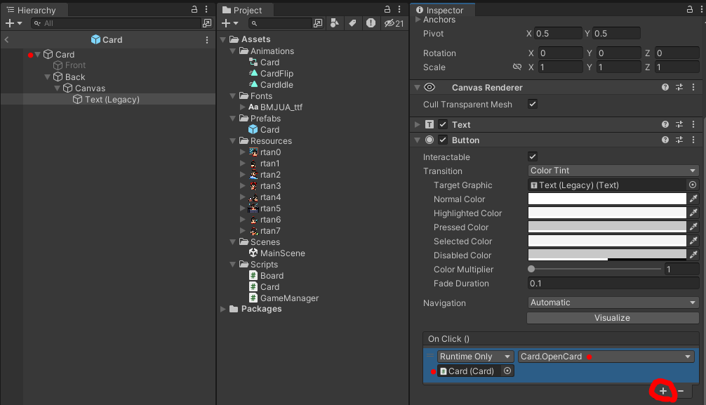 그리고 카드가 눌러지면 뒤집혀야하니까 Button 컴포넌트를 넣어주시고, On Click에서 '+' 버튼을 클릭합니다.