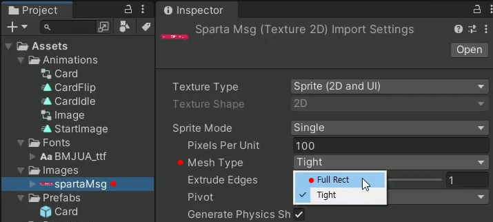 따라서, Full Rect는 이미지의 전체 영역을 메쉬로 만들고 Tight는 이미지의 실제 내용에만 집중된 메쉬를 만든다는 차이가 있습니다.