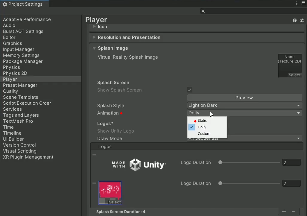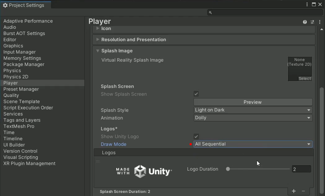 Player → Splash Image 열기